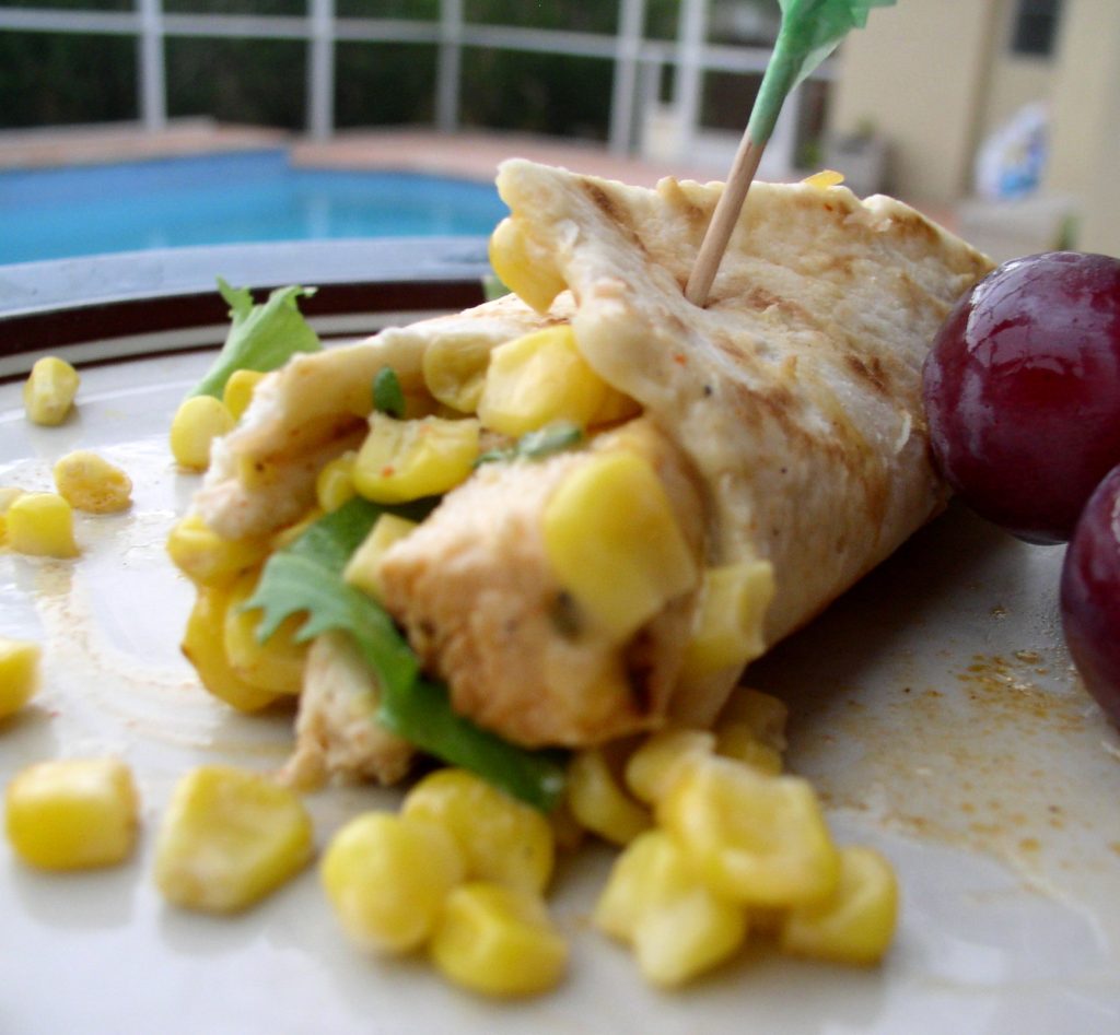 Layer wrap with strips of leftover chicken, corn & shredded mexican cheese.