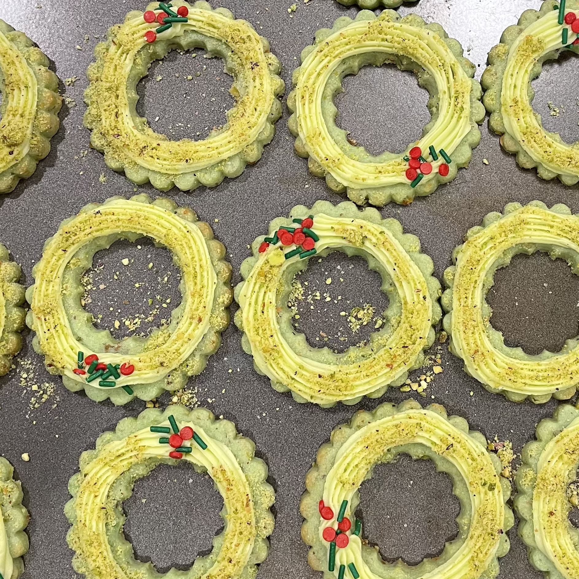 - The wreaths were made with 2 scalloped circles; piped with cookie frosting tinted green, tip 21; sprinkled with finely chopped pistachios.